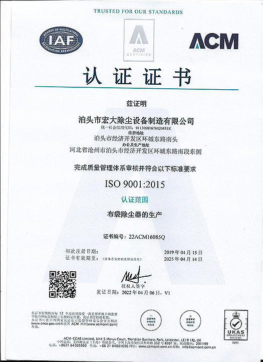 ISO9001認(rèn)證證書-ISO 9001認(rèn)證證書-宏大除塵設(shè)備