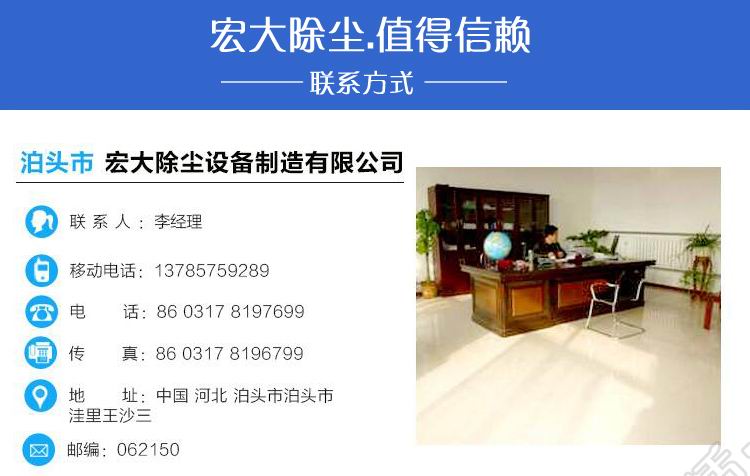 公司名稱:泊頭市宏大除塵設(shè)備制造有限公司 公司地址:泊頭市開發(fā)區(qū)環(huán)城東路南首1號(hào) 電話:0317-8392799 8162866 傳真:0317-8392977 手機(jī):18931764475 網(wǎng)址: